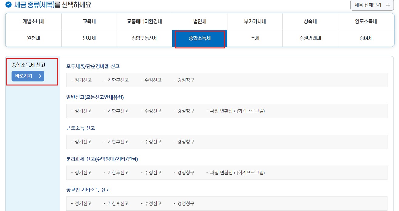 3. '종합소득세 신고' 바로가기 버튼을 누르고 신고서를 작성하고 제출합니다.