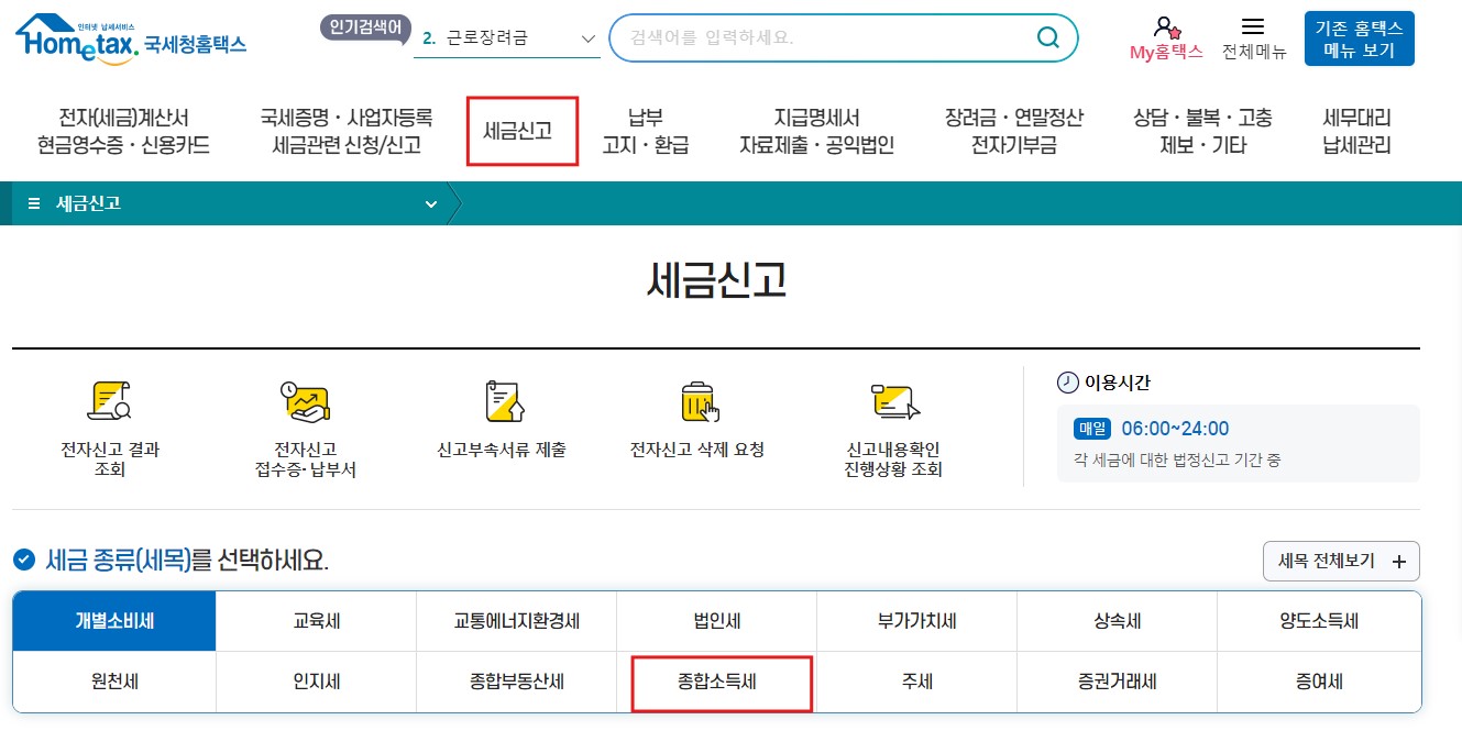 1. 홈택스에 접속하여 세금신고 메뉴로 이동합니다.